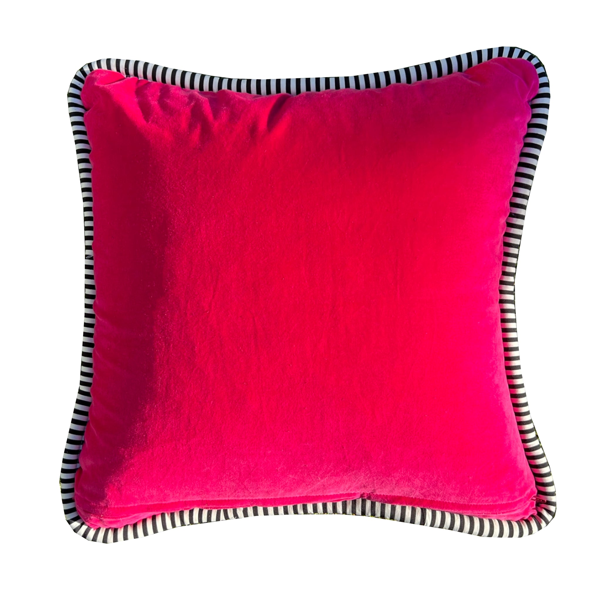 The Sunraysia Cushion features a timeless flower print in a sateen cotton weave fabric on the front. The reverse features a burst of fuchsia vintage washed velveteen, complimented with a striking black and white piping.